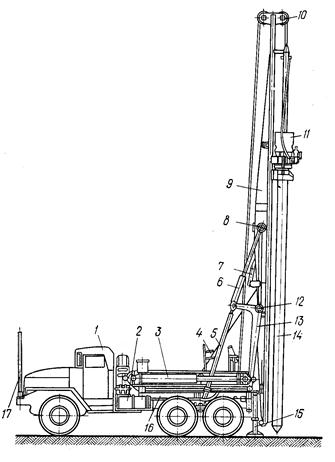 Рисунок 2.13 – Копровое оборудование КО-8 на базе автомашины КрАЗ-257К: 1 – автомобиль; 2 – топливный бак; 3 – гидромультипликаторы подъема молота и сваи; 4 – пульт управления; 5 – гидроцилиндры выдвижения рамы; 6 – гидроцилиндры наклона мачты; 7 – гидроцилиндр выдвижения стрелы; 8 – гидроцилиндр перемещения мачты; 9 – мачта; 10 – головка с блоками; 11 – молот; 12 – подвеска мачты; 13 – рама; 14 – свая; 15 – выносные опоры; 16 – нижняя рама; 17 – опора мачты