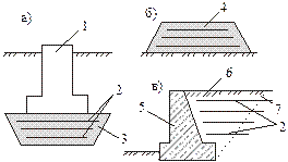 Рисунок 3.8 – Армирование грунта: а – в искусственном основании фундамента; б – при устройстве насыпи; в – при возведении обратных засыпок: 1 – фундамент; 2 – армирующие элементы; 3 – песчаная подушка; 4 – насыпь; 5 – подпорная стенка; 6 – призма обрушения; 7 – поверхность скольжения