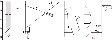 Равнодействующая давления пассивного отпора грунта на глубине t = 1,2 м (см. рисунок 4.12, г) R pg = (68+124,7)×1,2/2 = 115,6 кН.