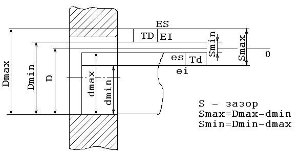 Зазором называют разность между размерами отверстия и вала, если размер отверстия больше размера вала. Величина зазора зависит от размеров соединяющих деталей и может изменяться от Smin до Smax – это предельное значение зазора.