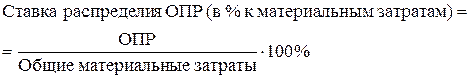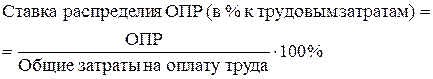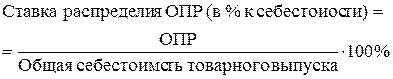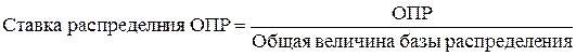 Важным этапом в распределении общепроизводственных (общехозяйственных) расходов является расчет ставок распределения расходов. Под ставкой распределения общепроизводственных (общехозяйственных) расходов понимается ставка, предназначенная для расчета суммы общепроизводственных (общехозяйственных) расходов на единицу носителя затрат и исчисляемая как отношение суммы расходов к соответствующему ему уровню производственной активности. Общая формула для расчета ставки распределения общепроизводственных расходов (ОПР) такова:
