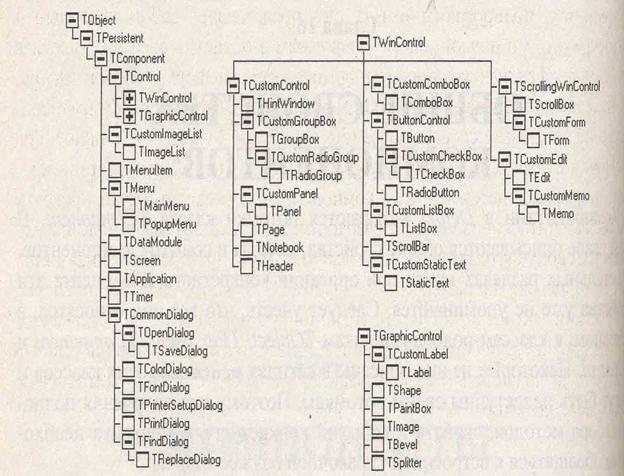 Класс TComponent служит базой для создания как видимых, так и невидимых компонентов. Большинство видимых (визуальных) компонентов происходит от класса TControl. Два наследника этого класса – TWinControl и TGraphicControl определяют две группы компонентов: