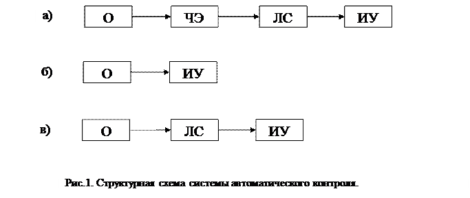 Структурные схемы такой системы показаны на рис. 1а, б, в, где каждый из элементов представлен прямоугольником; стрелки между прямоугольниками показывают направление передачи сигналов с одного элемента на другой. Элементы характеризуются сигналами на входе и выходе, называемыми также входными и выходными сигналами. Здесь передача сигнала идет в одном направлении, т.е. от объекта к измерительному устройству. Такие системы автоматического контроля называют разомкнутыми. В некоторых системах контроля чувствительный элемент является измерительным элементом устройства. В этом случае линия связи между чувствительным и измерительным элементами отсутствует, а структурные схемы контроля соответствуют схемам 1б, в.