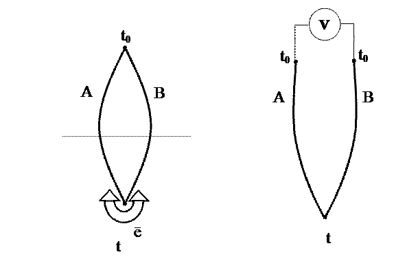 Учитывая оба фактора, определяющие суммарную термо-ЭДС замкнутой цепи из двух проводников А и В, спаи которых нагреты до температур t и t0, обходя цепь в направлении против часовой стрелки, получим