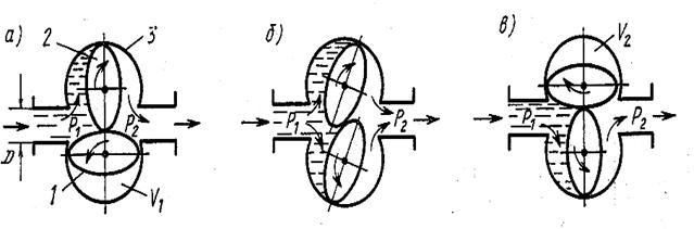 Вращение шестерни происходит в направлении стрелок. В положении, представленном на левом рисунке, происходит заполнение объема между корпусом и левой частью шестерни 2, а объем правее этой шестерни вытесняется. В том же положении между шестерней 1 и корпусом отсекается измеряемый объем жидкости V1, которая будет затем вытесняться в положениях, представленных на рисунках б и в.