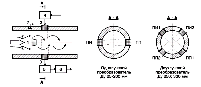 В корпусе проточной части расположено тело обтекания – призма трапецеидальной формы (1), пьезоизлучатели ПИ (2), пьезоприемники ПП (3) и термодатчик (7).