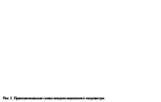 На рис.1. показана принципиальная схема конденсационного гигрометра точки росы. Охладителем является полупроводниковая термоэлектрическая батарея ПТ, работающая на принципе эффекта Пельтье: при прохождении тока в термоэлектрической цепи температура одного спая повышается, другого понижается. К холодному спаю полупроводникового термоэлемента припаяно металлическое зеркало 3. сила тока, проходящего через термоэлемент, регулируется переменным сопротивлением 4. Для измерения температуры металлического зеркала к его поверхности припаян полупроводниковый термоэлектропреобразователь Т, подключенный к милливольтметру со шкалой, градуированной в единицах абсолютной влажности.