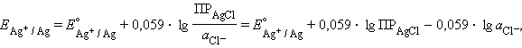 Однако в присутствии труднорастворимого AgCl активность ионов серебра очень мала, и ее трудно определить. Но активность ионов Ag+ связана с легко задаваемой в данной системе активностью ионов Cl– произведением растворимости хлорида серебра ПРAgCl: