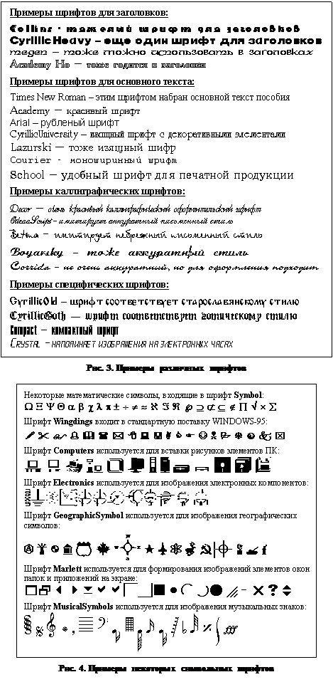 В современных ПК используются тысячи разных шрифтов. Одни отличаются строгостью и предназначены для деловых документов, другие – художественные, имитируют, например, готический или древний стиль и часто используются для заголовков. Существует целая гамма каллиграфических шрифтов, имитирующих рукописные стили. Их название может содержать слово Script. Есть и декоративные шрифты, в названии которых может встречаться слово Decorative (рис. 3). Кроме символов букв и цифр часто используются специальные знаки. Для упрощения использования их объединяют в символьные шрифты (рис. 4).