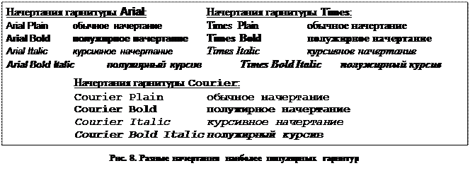 Внешний вид символов, составляющих шрифтовой набор, называется гарнитурой. Название шрифта, как правило, и определяет гарнитуру. В компьютерах наиболее часто используются гарнитуры, приведенные на рис. 8. Обычно шрифтовой комплект одной гарнитуры имеет четыре начертания: