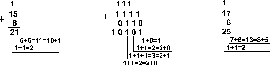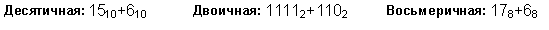 Пример 1. Сложим числа 15 и 6 в различных системах счисления.