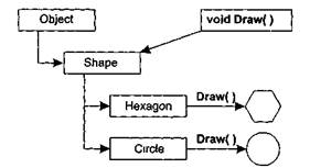 Для примера мы вновь обратимся к нашей иерархии геометрических фигур. Предположим, что в классе Shape (геометрическая фигура) определена функция Draw() — рисование, которая не принимает параметров и ничего не возвращает Поскольку геометрические фигуры бывают разными и каждый тип фигуры потребуется изображать своим собственным уникальным способом, скорее всего, нам потребуется в производных классах (таких как Hexagon — шестиугольник и Circle — окружность) создать свой собственный метод Draw(), заместив им метод Draw() базового класса (рис. 3.5).