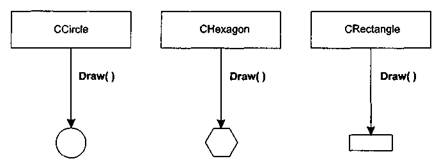 Обратите внимание, что общего предка — базового класса для ССircle, СНехаgon и CRectangle не существует. Однако в каждом классе предусмотрен метод Draw() с одинаковой сигнатурой. Для того чтобы продемонстрировать применение полиморфизма этого типа в реальном коде, мы воспользуемся примером на Visual Basic 6.0. До изобретения VB.NET Visual Basic не поддерживал классический полиморфизм (так же, как и классическое наследование), заставляя разработчиков сосредоточивать свои усилия на полиморфизме ad hoc.