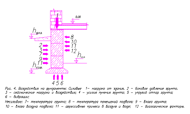 Работа фундаментов проходит в сложных условиях на них воздействуют силовые и не силовые нагрузки и воздействия (Рис.4)