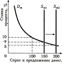 На рис. приведены типичные кривые спроса и предложения денег. Кривая предложения Sm имеет форму вертикальной прямой при допущении, что центральный банк, контролирующий денежное предложение, стремится поддерживать его на фиксированном уровне независимо от изменений номинальной процентной ставки. Как и на любом рынке, равновесие на денежном рынке имеет место в точке пересечения кривых спроса и предложения.