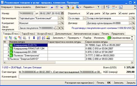 Оформить документы (Оформить реализацию) - с помощью этой кнопки можно произвести ввод документов (реализация, приходный кассовый ордер и счет-фактура) и распечатать формы документов.