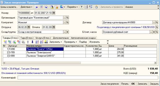 Использовать плановую себестоимость - флаг доступен только в документах Заказ покупателя и Заказ поставщику. Используется для контроля отпускных цен при оформлении менеджером заказов покупателей, а также для контроля цен поставки в документах Заказ поставщику.