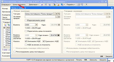 Дополнительный диалог Цены и валюта для заполнения и изменения данных об установленном порядке оплаты открывается при нажатии кнопки Цены и валюта в форме документа.