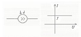 2. Источник тока j, J – это такой элемент, через который при любом напряжении между его зажимами проходит один и тот же ток равный величине источника тока. Если величина источника тока равна 0 (j=0), то i = j = u/R = 0, то при любом напряжении ток на этом участке будет равен нулю (разрыв цепи). Поэтому считают, что внутреннее сопротивление источника тока бесконечно: Rвн j =