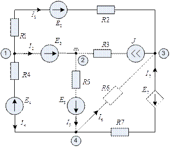 а. В схеме нет ветвей типа Е, тогда заземляют любой узел схемы. Записывают (nУ - 1) уравнений МУП, где nУ - число узлов схемы.