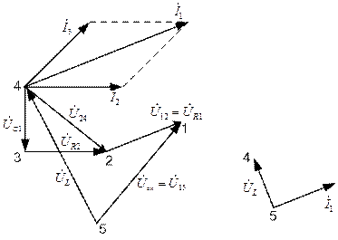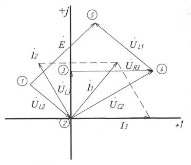 (в этом случае для получения большинства потенциалов точек схемы надо будет прибавлять напряжение на элементах схемы, что проще, чем вычитать их). Точку 4 располагают в начале комплексной плоскости.