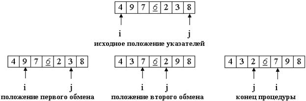 Далее, если i <= j, меняем a[i] и a[j] местами и продолжаем двигать i,j по тем же правилам...