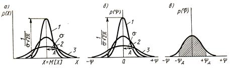 Математическое ожидание является тем значением величины, вокруг которого группируются результаты отдельных наблюдений (см. рис. 2), а среднеквадратическое отклонение характеризует рассеяние результатов отдельных наблюдений относительно математического ожидания, т. е. форму кривой распределения плотности вероятности, площадь под которой всегда равна единице. На рисунке показаны кривые закона нормального распределения (кривые Гаусса) случайной величины Х (рис. 2, а) и ее случайной погрешности
