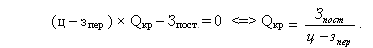 Точка безубыточности (Qкр) – это показатель, характеризующий объем реализации продукции, при котором выручка предприятия от продажи продукции (работ, услуг) позволяет покрыть все расходы и выйти на нулевой уровень прибыли (П = 0). Точку безубыточности можно найти из уравнения: