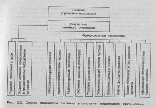 Система управления персоналом организации — система, в которой реализуются функции управления персоналом. Она включает подсистему линейного руководства, а также ряд функциональных подсистем, специализирующихся на выполнении однородных функций (рис. 2.2).