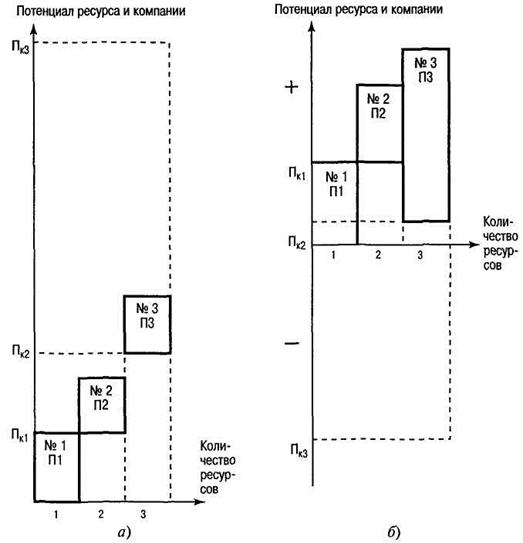а) общий потенциал компании Пк3 меньше простой суммы потенциалов, входящих в него ресурсов П1, П2, П3, б) общий потенциал компании Пк3 больше простой суммы потенциалов, входящих в него ресурсов П1, П2, П3;