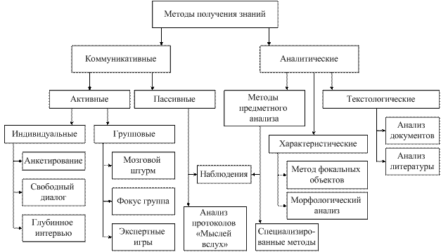 Из предложенной схемы классификации видно, что основной принцип деления связан с источником знаний. Коммуникативные методы охватывают все виды контактов с живым источником знаний - экспертом, а аналитические касаются методов извлечения знаний из документов, специальной литературы, исследований в предметной области. Разделение этих групп методов на верхнем уровне классификации не означает их противоречивости, для качественного проведения процедуры анализа аналитик должен в своей работе использовать различные методы из различных групп.