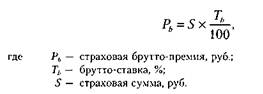 Нетто-премия представляет собой основную часть брутто-премии. По аналогии с ней брутто-премию тоже удобно представлять как произведение страховой суммы на страховой тариф, или тарифную ставку. Тарифная ставка, определяющая величину всего страхового взноса, называется брутто-ставкой и представляет собой платеж со 100 руб. страховой суммы или процентную ставку от страховой суммы: