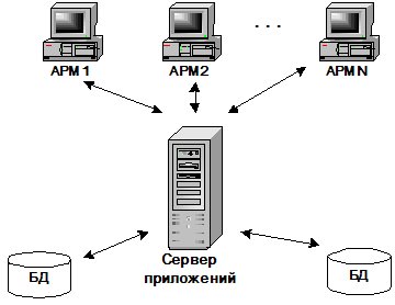 Данная клиент-серверная архитектура характеризуется наличием двух взаимодействующих самостоятельных модулей - автоматизированного рабочего места (АРМа) и сервера базы данных, в качестве которого может выступать Microsoft SQL Server, Oracle, Sybase и другие. Сервер БД отвечает за хранение, управление и целостность данных, а также обеспечивает возможность одновременного доступа нескольких пользователей. Клиентская часть представлена так называемым “толстым” клиентом, то есть приложением (АРМ) на котором сконцентрированы основные правила работы системы и расположен пользовательский интерфейс программы. При всей простоте построения такой архитектуры, она обладает множеством недостатков, наиболее существенные из которых - это высокие требования к сетевым ресурсам и пропускной способности сети компании, а также сложность обновления программного обеспечения из-за “размазанной” бизнес-логики между АРМом и сервером БД. Кроме того, при большом количестве АРМов возрастают требования к аппаратному обеспечению сервера БД, а это, как известно, самый дорогостоящий узел в любой информационной системе.