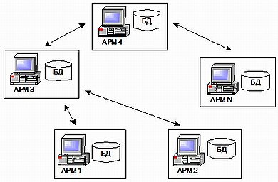 Каждый АРМ независим, содержит только ту информацию, с которой должен работать, а актуальность данных во всей системе обеспечивается благодаря непрерывному обмену сообщениями с другими АРМами. Обмен сообщениями между АРМами может быть реализован различными способами, от отправки данных по электронной почте до передачи данных по сетям.
