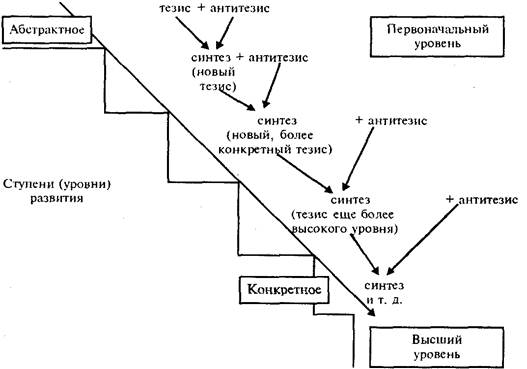 • данный процесс происходит снова и снова, и каждый раз в результате синтеза противоположных тезисов образуется тезис все более и более высокого уровня.