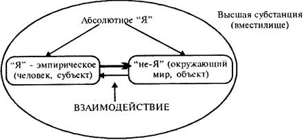 • "Я" (активное творение, начало, субъект, сознание человеческой личности) взаимодействует с "не-Я" (пассивным началом — окружающим миром) внутри Абсолютного Я (вместилища, высшей субстанции).