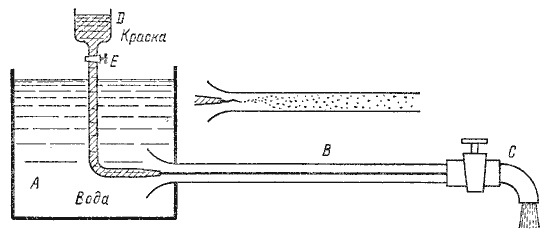 Установка состоит из резервуара А с водой, от которого отходит стеклянная труба В с краном С на конце, и сосуда D с водным раствором краски, которая может по трубке вводиться тонкой струйкой внутрь стеклянной трубы В.