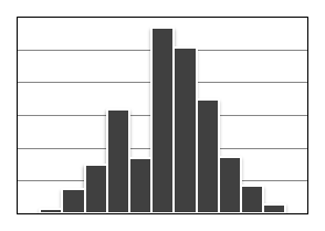Обычная (симметричная, колоколообразная) форма. Среднее значение гистограммы соответствует середине размаха данных. Максимальная частота также приходится на середину и постепенно уменьшается к обоим концам. Форма симметричная.