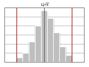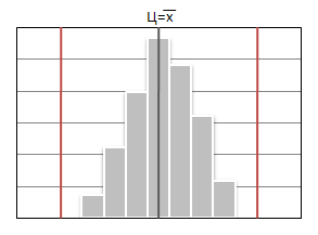 Гистограмма имеет вид обычного распределения. Среднее значение гистограммы совпадает с центром поля допуска. Ширина гистограммы равна ширине интервала допуска, в связи с чем возникают опасения появления некондиционных деталей как со стороны верхнего, так и со стороны нижнего полей допуска.