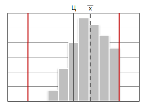 Гистограмма имеет вид обычного распределения. Ширина гистограммы меньше ширины поля допуска с запасом. Среднее значение гистограммы сдвинуто влево (вправо) относительно центра интервала допуска, в связи с чем имеются опасения, что могут находится некондиционные детали со стороны нижней (верхней) границы поля допуска.