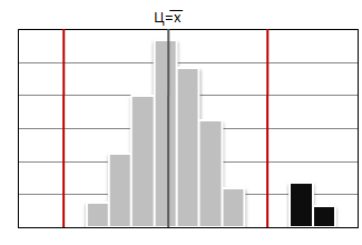Центр гистограммы смещен к верхнему (нижнему) пределу допуска, причем правая (левая) сторона гистограммы рядом с верхней (нижней) границей допуска имеет резкий обрыв. Кроме того один или несколько интервалов выходят за границы поля допуска.