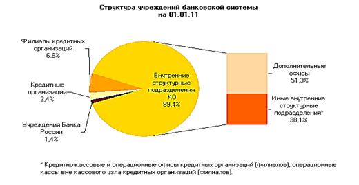Количество учреждений банковской системы, предоставляющих платежные услуги, увеличилось за год на 1,28% и на 1.01.2011 составило 42,9 тыс. единиц (см. рисунок 2.1). В институциональной структуре банковского сектора произошли следующие изменения (см. рисунок 2.2). За 2010 год наблюдается динамика сокращения кредитных учреждений Банка России на 3,49% и кредитных организаций на 4,35%, в том числе филиалов кредитных организаций на 8,07%, что обуславливается проводимой политикой ЦБРФ. Вместе с тем число дополнительных офисов кредитных организаций выросло на 1,5%, также при росте иных внутренних структурных подразделений кредитных организаций на 3,38%. В целом НПС проявляет положительную количественную динамику роста в основном за счёт увеличения внутренних структурных подразделений кредитных организаций. Рост привлекательности операционных офисов по сравнению с другими организационными формами предоставления банковских услуг обусловлен, прежде всего, упрощенным порядком их регистрации и достаточно широким перечнем осуществляемых банковских операций.