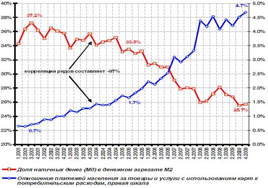 Рисунок П. 2.1 - Взаимосвязь между долей наличных денег в денежной массе и долей «карточных» платежей в потребительских расходах РФ[8]