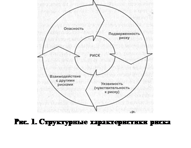 Структурно риск можно описать с помощью следующих характеристик: опасность, подверженность риску, уязвимость (чувствительность к риску) и степень взаимодействия рисков (рис.1).