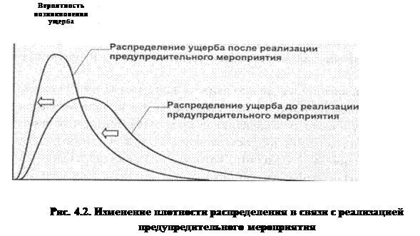 Наглядным примером визуализации является сравнение распределения ущерба до реализации какого-либо предупредительного мероприятия и соответствующего распределения после его осуществления. На рис. 4.2 представлено сравнение плотностей распределений ущерба до и после предупредительных мероприятий (стрелками обозначен вызванный этим сдвиг). Сравнение графиков позволяет визуально оценить результативность предлагаемых мер. Однако такая картинка всего лишь делает процесс наглядным, для получения же точных оценок необходимо рассчитывать характеристики распределения и/или проводить проверку статистических гипотез на основе критериев согласия.