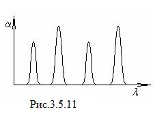 В случае газов и паров металлов при невысоком давлении для всех длин волн коэффициент поглощения практически равен нулю, и лишь для очень узких спектральных интервалов δλ (порядка нескольких тысячных нм) обнаруживаются резкие максимумы (рис.3.5.11). Эти максимумы соответствуют резонансным частотам колебаний электронов внутри атомов, которые практически не взаимодействуют друг с другом.