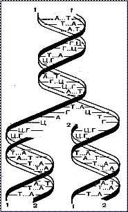 Рис. 15. Полинуклеотидные цепи двойной спирали ДНК расплетаются и образуются две новые двойные спирали. Каждая из них состоитизродительской (1) и вновь синтезированной (2) цепи.