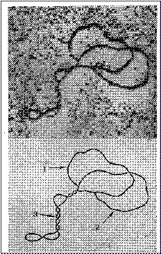 Рис. 16. Молекула ДНК вируса в процессе репликации. Вверху — электронная микрофотография, внизу — схема.