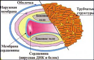 Вирионы имеют кирпичеобразную или овоидную форму. Поверхность вириона состоит из нитевидных, овоидных элементов. Оболочка и наружная мембрана вириона заключает сердцевину (ДНК и белки) и мембрану сердцевины, которые находятся между двух боковых тел (рис. 25).