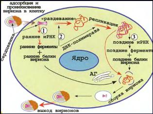 Репродукция. Вирион проникает с помощью фагоцитарной вакуоли. В вакуоле наружная мембрана вириона удаляется. Затем, с помощью фермента вируса, происходит транскрипция ранних генов (рис. 26, 1). Образуются иРНК, кодирующие ранние ферменты: «раздевающий белок» (рис. 26, 2), удаляющий мембрану сердцевины, освобождая вирусную ДНК в цитоплазму; вирусная ДНК-полимераза, реплицирующая геном. В результате поздней транскрипции (рис. 26, 3) ДНК и белки вируса собираются в сердцевину с сердцевинной мембраной.